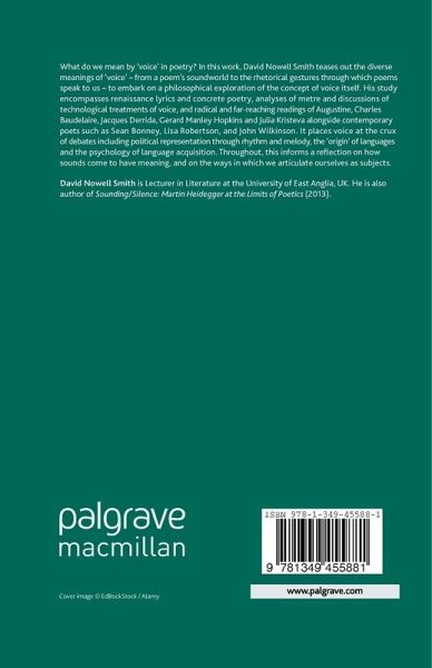 What do we mean by 'voice' in poetry? In this work, David Nowell Smith teases out the diverse meanings of 'voice', from a poem's soundworld to the rhetorical gestures through which poems speak to us, in order to embark on a philosophical exploration of the concept of voice itself.