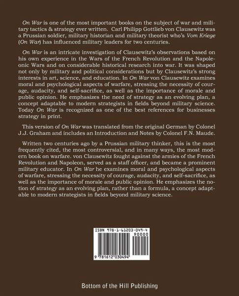 On War is one of the most important books on the subject of war and military tactics & strategy ever written. Carl Philipp Gottlieb von Clausewitz was a Prussian soldier, military historian and military theorist who's Vom Kriege (On War) has influenced military leaders for two centuries. On War is an intricate investigation of Clausewitz's observations based on his own experience in the Wars of the French Revolution and the Napoleonic Wars and on considerable historical research into war. It was shaped not only by military and political considerations but by Clausewitz's strong interests in art, science, and education. In On War von Clausewitz examines moral and psychological aspects of warfare, stressing the necessity of courage, audacity, and self-sacrifice, as well as the importance of morale and public opinion. He emphasizes the need of strategy as an evolving plan, a concept adaptable to modern strategists in fields beyond military science. Today On War is recognized as one of the best references for businesses strategy in print. This version of On War was translated from the original German by Colonel J.J. Graham and includes an Introduction and Notes by Colonel F.N. Maude. Written two centuries ago by a Prussian military thinker, this is the most frequently cited, the most controversial, and in many ways, the most modern book on warfare. von Clausewitz fought against the armies of the French Revolution and Napoleon, served as a staff officer, and became a prominent military educator. In On War he examines moral and psychological aspects of warfare, stressing the necessity of courage, audacity, and self-sacrifice, as well as the importance of morale and public opinion. He emphasizes the notion of strategy as an evolving plan, rather than a formula, a concept adaptable to modern strategists in fields beyond military science.