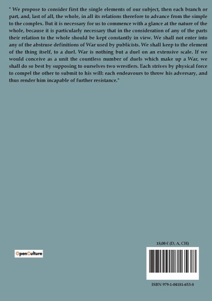 " We propose to consider first the single elements of our subject, then each branch or part, and, last of all, the whole, in all its relations therefore to advance from the simple to the complex. But it is necessary for us to commence with a glance at the nature of the whole, because it is particularly necessary that in the consideration of any of the parts their relation to the whole should be kept constantly in view. We shall not enter into any of the abstruse definitions of War used by publicists. We shall keep to the element of the thing itself, to a duel. War is nothing but a duel on an extensive scale. If we would conceive as a unit the countless number of duels which make up a War, we shall do so best by supposing to ourselves two wrestlers. Each strives by physical force to compel the other to submit to his will: each endeavours to throw his adversary, and thus render him incapable of further resistance."