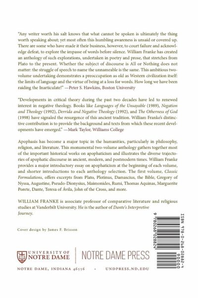 Apophasis has become a major topic in the humanities, particularly in philosophy, religion, and literature. This monumental two-volume anthology gathers together most of the important historical works on apophaticism and illustrates the diverse trajectories of apophatic discourse in ancient, modern, and postmodern times. William Franke provides a major introductory essay on apophaticism at the beginning of each volume, and shorter introductions to each anthology selection. The first volume, Classic Formulations, offers excerpts from Plato, Plotinus, Damascius, the Bible, Gregory of Nyssa, Augustine, Pseudo-Dionysius, Maimonides, Rumi, Thomas Aquinas, Marguerite Porete, Dante, Teresa of Ávila, John of the Cross, and more.