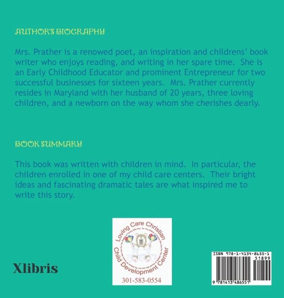 This book was written with children in mind. In particular, the children enrolled in one of my child care centers. Their bright ideas and fascinating dramatic tales are what inspired me to write this story.