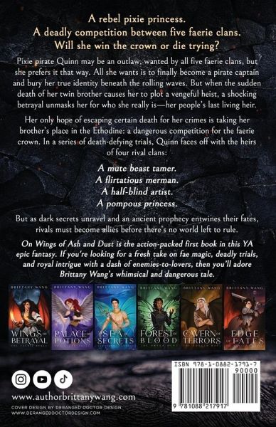 A rebel pixie princess. A deadly competition between five faerie clans. Will she win the crown or die trying? Pixie pirate Quinn may be an outlaw, wanted by all five faerie clans, but she prefers it that way. All she wants is to finally become a captain and bury her true identity beneath the rolling waves. But when the sudden death of her twin brother causes her to plot a vengeful heist, a shocking betrayal unmasks her for who she really is-her people's last living heir. Her only hope of escaping certain death for her crimes is taking her brother's place in the Ethodine: a dangerous competition for the faerie crown. In a series of death-defying trials, Quinn faces off with the heirs of four rival clans: A flirtatious merman. A mute beast tamer. A half-blind artist. And a pompous princess. But as dark secrets unravel and an ancient prophecy entwines their fates, rivals must become allies before there's no world left to rule. On Wings of Ash and Dust is the action-packed first book in this YA epic fantasy. If you're looking for a fresh take on fae magic, deadly trials, and royal intrigue with a dash of enemies-to-lovers, then you'll adore Brittany Wang's whimsical and dangerous tale. Buy On Wings of Ash and Dust to dive into the adventure today! 2025 IngramSpark® Editorial Selection - Young Adult