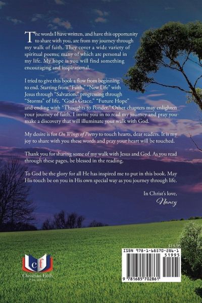 The words I have written, and have this opportunity to share with you, are from my journey through my walk of faith. They cover a wide variety of spiritual poems; many of which are personal in my life. My hope is you will find something encouraging and inspirational. I tried to give this book a flow from beginning to end. Starting from "Faith," "New Life" with Jesus through "Salvation," progressing through "Storms" of life, "God's Grace," "Future Hope" and ending with "Thoughts to Ponder." Other chapters may enlighten your journey of faith. I invite you in to read my journey and pray you make a discovery that will illuminate your walk with God. My desire is for On Wings of Poetry to touch hearts, dear readers. It is my joy to share with you these words and pray your heart will be touched. Thank you for sharing some of my walk with Jesus and God. As you read through these pages, be blessed in the reading. To God be the glory for all He has inspired me to put in this book. May His touch be on you in His own special way as you journey through life. In Christ's love, Nancy
