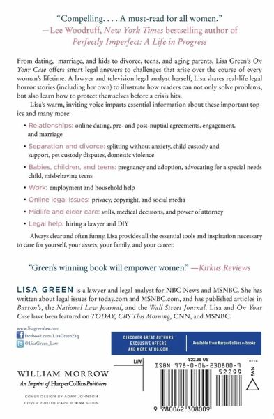 Television legal analyst and attorney Lisa Green offers something new: a witty, direct and empowering legal guide for women, filled with accessible information they can employ to understand and respond to common legal issues throughout their lives, from dating, marriage, and kids to jobs, retirement, aging parents, and wills. Lisa Green has an urgent message for women of all ages, especially those who consider themselves fully briefed on nutrition, personal finance, good schools, and great bargains: What about the law? Whether or not you invite it into your life, the law will find you. When it does, will you be ready to respond? In On Your Case, Lisa fills a long-standing gap in women's bookshelves with a thorough, compelling and occasionally hilarious guide to the range of legal issues women can expect to confront throughout their busy lives. Leveraging her professional training as a lawyer and her personal experience as a wife, ex-wife, mother, and daughter, Lisa explains common, even complicated, legal issues in practical, easy to understand terms. Sharing true stories, from jaw-dropping court cases to her own personal challenges, Lisa explains how readers can make the best possible decisions when problems arise. And legal problems will arise, Lisa counsels, so women need to get smart, and get ready. In her warm, yet firm, voice, Lisa guides readers through the potential legal issues around: Relationships: Online dating, pre and postnuptial agreements, engagement and marriage Separation and Divorce: Splitting without anxiety, child custody and support, pet custody disputes Babies, Children and Teens: Pregnancy and adoption, advocating for a special needs child, misbehaving teens Work: Employment and household help Domestic violence Social media Midlife and elder care: Wills, medical decisions and power of attorney Legal Help: Hiring a lawyer, DIY As Suze Orman demystified personal finance and put women in the driver's seat of their own financial future, Lisa Green now does for the law. With On Your Case, Lisa empowers you by equipping you with the tools you need to take care of yourself, your assets, your family, and your career.