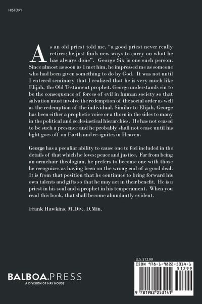 As an old priest told me, "a good priest never really retires; he just finds new ways to carry on what he has always done". George Six is one such person. Since almost as soon as I met him, he impressed me as someone who had been given something to do by God. It was not until I entered seminary that I realized that he is very much like Elijah, the Old Testament prophet. George understands sin to be the consequence of forces of evil in human society so that salvation must involve the redemption of the social order as well as the redemption of the individual. Similar to Elijah, George has been either a prophetic voice or a thorn in the sides to many in the political and ecclesiastical hierarchies. He has not ceased to be such a presence and he probably shall not cease until his light goes off on Earth and re-ignites in Heaven. George has a peculiar ability to cause one to feel included in the details of that which he loves: peace and justice. Far from being an armchair theologian, he prefers to become one with those he recognizes as having been on the wrong end of a good deal. It is from that position that he continues to bring forward his own talents and gifts so that he may act in their benefit. He is a priest in his soul and a prophet in his temperament. When you read this book, that shall become abundantly evident. Frank Hawkins, M.Div., D.Min.