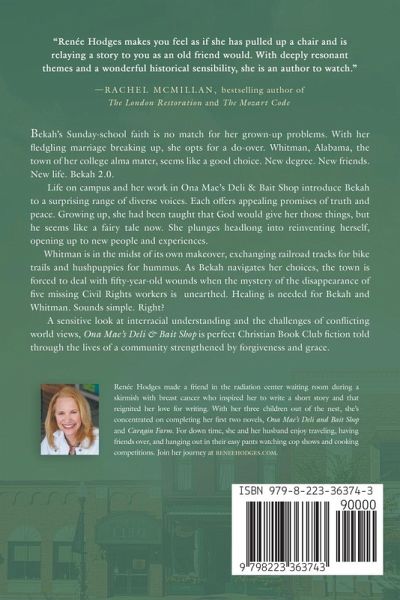 Immersive, warm and utterly appealing, Hodges makes you feel as if she has pulled up a chair and is relaying a story to you as an old friend would. Renée Hodges is an author to watch. -- Rachel McMillan, bestselling author of The London Restoration and the Mozart Code Bekah's Sunday-school faith is no match for her grown-up problems. With her fledgling marriage breaking up, she opts for a do-over. Whitman, Alabama, the town of her college alma mater, seems like a good choice. New degree. New friends. New life. Bekah 2.0. Life on campus and her work in Ona Mae's Deli & Bait Shop introduce Bekah to a surprising range of diverse voices. Each offers appealing promises of truth and peace. Growing up, she had been taught that God would give her those things, but he seems like a fairy tale now. She plunges headlong into reinventing herself, opening up to new people and experiences. Whitman is in the midst of its own makeover, exchanging railroad tracks for bike trails and hushpuppies for hummus. As Bekah navigates her choices, the town is forced to deal with fifty-year-old wounds when the mystery of the disappearance of five missing Civil Rights workers is unearthed. Healing is needed for Bekah and Whitman. Sounds simple. Right? A sensitive look at interracial understanding and the challenges of conflicting world views, Ona Mae's Deli & Bait Shop is perfect Christian Book Club fiction told through the lives of a community strengthened by forgiveness and grace.