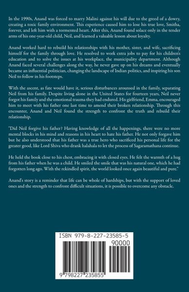 In the 1990s, Anand was forced to marry Malini against his will due to the greed of a dowry, creating a toxic family environment. This experience caused him to lose his true love, Smitha, forever, and left him with a tormented heart. After this, Anand found solace only in the tender arms of his one-year-old child, Neil, and learned a valuable lesson about loyalty. Anand worked hard to rebuild his relationships with his mother, sister, and wife, sacrificing himself for the family through love. He resolved to work extra jobs to pay for his children's education and to solve the issues at his workplace, the municipality department. Although Anand faced several challenges along the way, he never gave up on his dreams and eventually became an influential politician, changing the landscape of Indian politics, and inspiring his son Neil to follow in his footsteps. With the ascent, as fate would have it, serious disturbances arounsed in the family, separating Neil from his family. Despite living alone in the United States for fourteen years, Neil never forgot his family and the emotional trauma they had endured. His girlfriend, Emma, encouraged him to meet with his father one last time to amend their broken relationship. Through this encounter, Anand and Neil found the strength to confront the truth and rebuild their relationship. "Did Neil forgive his father? Having knowledge of all the happenings, there were no more mental blocks in his mind and reasons in his heart to hate his father. He not only forgave him but he also understood that his father was a true hero who sacrificed his personal life for the greater good, like Lord Shiva who drank halahala to let the process of Sagaramathana continue. He held the book close to his chest, embracing it with closed eyes. He felt the warmth of a hug from his father when he was a child. He smiled the smile that was his natural one, which he had forgotten long ago. With the rekindled spirit, the world looked once again beautiful and pure." Anand's story is a reminder that life can be whole of hardships, but with the support of loved ones and the strength to confront difficult situations, it is possible to overcome any obstacle.