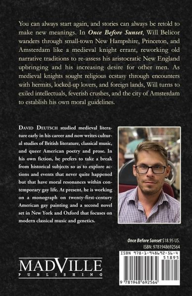 You can always start again, and stories can always be retold to make new meanings. In Once Before Sunset, Will Belicor wanders through small-town New Hampshire, Princeton, and Amsterdam like a medieval knight errant, reworking old narrative traditions to re-assess his aristocratic New England upbringing and his increasing desire for other men. As medieval knights sought religious ecstasy through encounters with hermits, locked-up lovers, and foreign lands, Will turns to exiled intellectuals, feverish crushes, and the city of Amsterdam to establish his own moral guidelines.