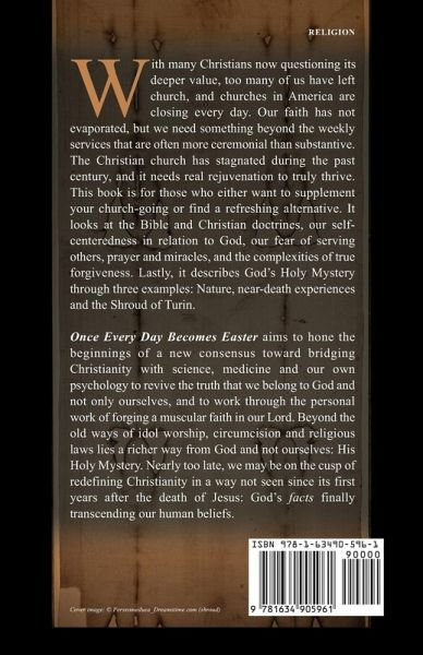 Once Every Day Becomes Easter aims to hone the beginnings of a new consensus toward bridging Christianity with science, medicine, and our own psychology to revive the truth that we belong to God and not only ourselves, and to work through the personal issues of forging a muscular faith in our Lord. Beyond the old ways of idol worship, circumcision, and religious laws lies a richer way from God and not ourselves: His Holy Mystery.
