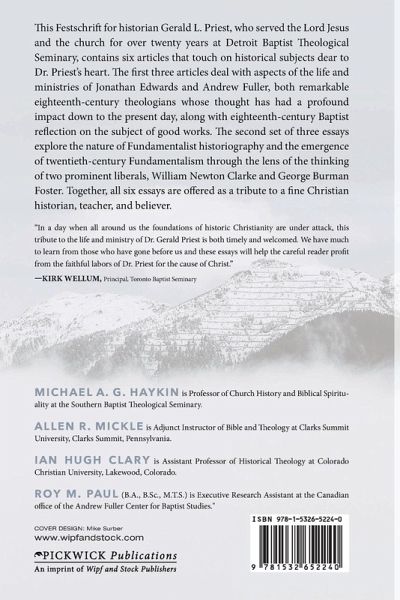 This Festschrift for historian Gerald L. Priest, who served the Lord Jesus and the church for over twenty years at Detroit Baptist Theological Seminary, contains six articles that touch on historical subjects dear to Dr. Priest's heart. The first three articles deal with aspects of the life and ministries of Jonathan Edwards and Andrew Fuller, both remarkable eighteenth-century theologians whose thought has had a profound impact down to the present day, along with eighteenth-century Baptist reflection on the subject of good works. The second set of three essays explore the nature of Fundamentalist historiography and the emergence of twentieth-century Fundamentalism through the lens of the thinking of two prominent liberals, William Newton Clarke and George Burman Foster. Together, all six essays are offered as a tribute to a fine Christian historian, teacher, and believer.