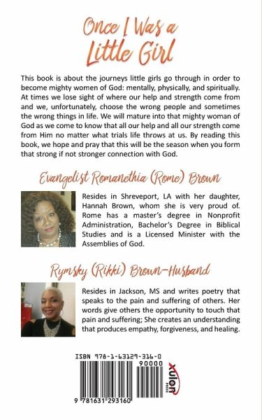 This book is about the journeys little girls go through in order to become mighty women of God: mentally, physically, and spiritually. At times we lose sight of where our help and strength come from and we, unfortunately, choose the wrong people and sometimes the wrong things in life. We will mature into that mighty woman of God as we come to know that all our help and all our strength come from Him no matter what trials life throws at us. By reading this book, we hope and pray that this will be the season when you form that strong if not stronger connection with God. Evangelist Romanethia (Rome) Brown Resides in Shreveport, LA with her daughter, Hannah Brown, whom she is very proud of. Rome has a master's degree in Nonprofit Administration, Bachelor's Degree in Biblical Studies and is a Licensed Minister with the Assemblies of God. Rymsky (Rikki) Brown-Husband Resides in Jackson, MS and writes poetry that speaks to the pain and suffering of others. Her words give others the opportunity to touch that pain and suffering; She creates an understanding that produces empathy, forgiveness, and healing.