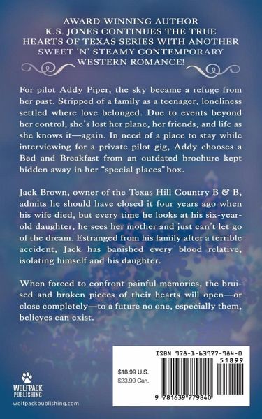 "Award-winning Author K.S. Jones continues the True Hearts of Texas series with another sweet 'n' steamy contemporary western romance! For pilot Addy Piper, the sky became a refuge from her past. Stripped of a family as a teenager, loneliness settled where love belonged. Now, with an industry-wide furlough, she's lost her plane, her friends, and life as she knows it-again. In need of a place to stay while interviewing for a private pilot gig, Addy chooses a Bed and Breakfast-the house nearly a replica of her childhood home-from an outdated brochure kept hidden away in her "special places" box. Jack Brown, owner of the Texas Hill Country B & B, admits he should have closed it four years ago when his wife died, but every time he looks at his six-year-old daughter, he sees her mother and just can't let go of the dream. Estranged from his family after a terrible accident, Jack has banished every blood relative, isolating himself and his daughter. When forced to confront painful memories, the bruised and broken pieces of their hearts will open, or close completely, to a future no one, especially them, believes can exist"--