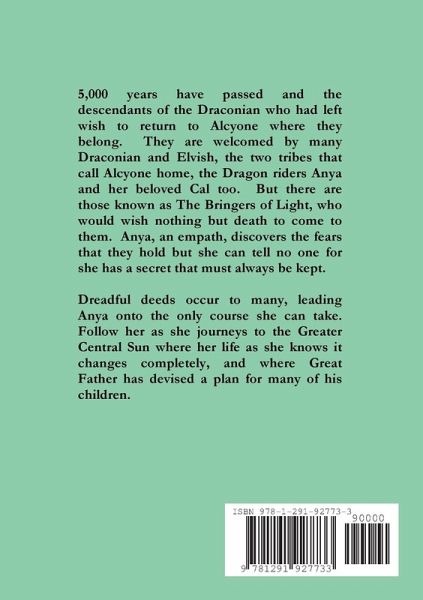5,000 years have passed and the descendants of the Draconian who had left wish to return to Alcyone where they belong. They are welcomed by many Draconian and Elvish, the two tribes that call Alcyone home, the Dragon riders Anya and her beloved Cal too. But there are those known as The Bringers of Light, who would wish nothing but death to come to them. Anya, an empath, discovers the fears that they hold but she can tell no one for she has a secret that must always be kept. Dreadful deeds occur to many, leading Anya onto the only course she can take. Follow her as she journeys to the Greater Central Sun where her life as she knows it changes completely, and where Great Father has devised a plan for many of his children.