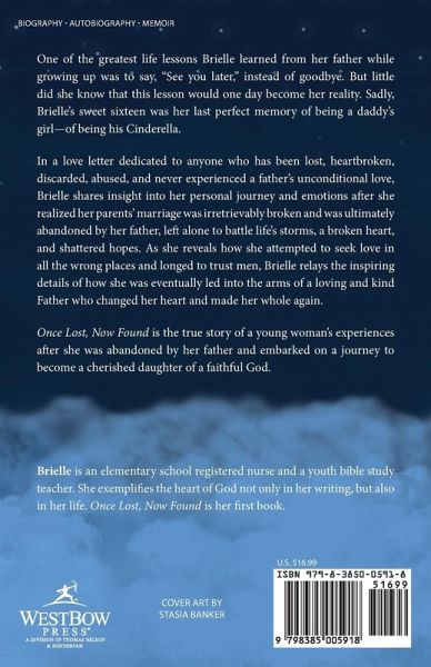 One of the greatest life lessons Brielle learned from her father while growing up was to say, "See you later," instead of goodbye. But little did she know that this lesson would one day become her reality. Sadly, Brielle's sweet sixteen was her last perfect memory of being a daddy's girl-of being his Cinderella. In a love letter dedicated to anyone who has been lost, heartbroken, discarded, abused, and never experienced a father's unconditional love, Brielle shares insight into her personal journey and emotions after she realized her parents' marriage was irretrievably broken and was ultimately abandoned by her father, left alone to battle life's storms, a broken heart, and shattered hopes. As she reveals how she attempted to seek love in all the wrong places and longed to trust men, Brielle relays the inspiring details of how she was eventually led into the arms of a loving and kind Father who changed her heart and made her whole again. Once Lost, Now Found is the true story of a young woman's experiences after she was abandoned by her father and embarked on a journey to become a cherished daughter of a faithful God.