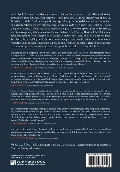 In this book, Andrew Hronich endeavors to synthesize the many strands of orthodox doctrine into a single telos: ultimate reconciliation. While a great deal of ink has already been spilled on this subject, this book addresses ponderances previously overlooked due to a lack of ecumenical dialogue between the differing streams of Christian tradition. Ancient lights, such as Origen, Gregory of Nyssa, and Clement of Alexandria are given a voice to speak again to the masses, whilst contemporary thinkers, such as Thomas Talbott, David Bentley Hart, and Eric Reitan, are unleashed upon the unwitting world of Christian philosophy. Stagnant tradition has hindered the church from abiding by its historic motto semper reformanda, but with its ecumenical voice, this book calls on Protestants, Catholics, and Orthodox adherents alike to acknowledge apokatastasis panton, the salvation of all beings, as the orthodoxy it always has been.