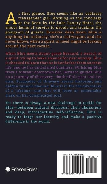 At first glance, Blue seems like an ordinary transgender girl. Working as the concierge at the Boon by the Lake Luxury Hotel, she enjoys being of service to people and tracking the goings-on of guests. However, deep down, Blue is anything but ordinary; she's a clairvoyant, and she never knows when a spirit in need might be lurking around the next corner. When Blue meets Avant-garde Bernard, a wretch of a spirit trying to make amends for past wrongs, Blue is shocked to learn that he is her father from another life, and he has unfinished business. Whisking Blue from a vibrant downtown bar, Bernard guides Blue on a journey of discovery-both of his past and her own. Escapades of thievery, secret histories, and hidden tunnels abound, Blue is in for the adventure of a lifetime-one that will leave an undeniable mark on her complicated soul. Yet there is always a new challenge to tackle for Blue-between natural disasters, alien abduction, and deep, introspective self-reflection, Blue is ready to forge her identity and make a positive difference in the world.