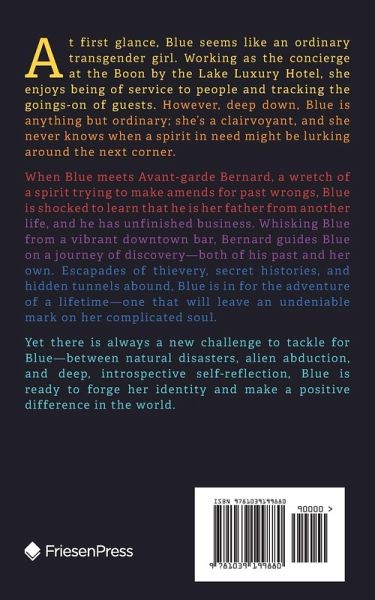 At first glance, Blue seems like an ordinary transgender girl. Working as the concierge at the Boon by the Lake Luxury Hotel, she enjoys being of service to people and tracking the goings-on of guests. However, deep down, Blue is anything but ordinary; she's a clairvoyant, and she never knows when a spirit in need might be lurking around the next corner. When Blue meets Avant-garde Bernard, a wretch of a spirit trying to make amends for past wrongs, Blue is shocked to learn that he is her father from another life, and he has unfinished business. Whisking Blue from a vibrant downtown bar, Bernard guides Blue on a journey of discovery-both of his past and her own. Escapades of thievery, secret histories, and hidden tunnels abound, Blue is in for the adventure of a lifetime-one that will leave an undeniable mark on her complicated soul. Yet there is always a new challenge to tackle for Blue-between natural disasters, alien abduction, and deep, introspective self-reflection, Blue is ready to forge her identity and make a positive difference in the world.
