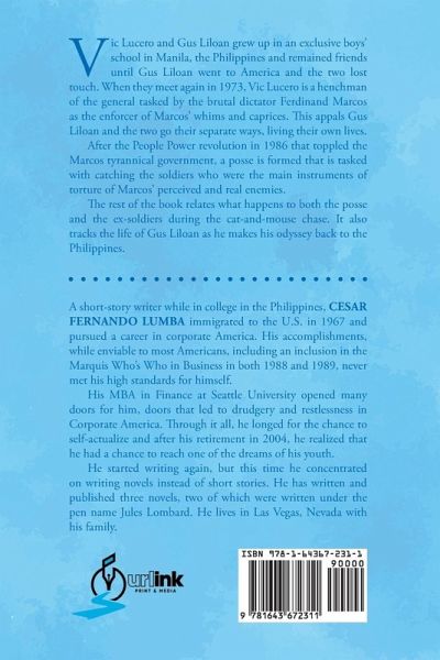 Vic Lucero and Gus Liloan grew up in an exclusive boys' school in Manila, the Philippines and remained friends until Gus Liloan went to America and the two lost touch. When they meet again in 1973, Vic Lucero is a henchman of the general tasked by the brutal dictator Ferdinand Marcos as the enforcer of Marcos' whims and caprices. is appals Gus Liloan and the two go their separate ways, living their own lives. After the People Power revolution in 1986 that toppled the Marcos tyrannical government, a posse is formed that is tasked with catching the soldiers who were the main instruments of torture of Marcos' perceived and real enemies. The rest of the book relates what happens to both the posse and the ex-soldiers during the cat-and-mouse chase. It also tracks the life of Gus Liloan as he makes his odyssey back to the Philippines. A short-story writer while in college in the Philippines, CESAR FERNANDO LUMBA immigrated to the U.S. in 1967 and pursued a career in corporate America. His accomplishments, while enviable to most Americans, including an inclusion in the Marquis Who's Who in Business in both 1988 and 1989, never met his high standards for himself. His MBA in Finance at Seattle University opened many doors for him, doors that led to drudgery and restlessness in Corporate America. rough it all, he longed for the chance to self-actualize and after his retirement in 2004, he realized that he had a chance to reach one of the dreams of his youth. He started writing again, but this time he concentrated on writing novels instead of short stories. He has written and published three novels, two of which were written under the pen name Jules Lombard. He lives in Las Vegas, Nevada with his family.