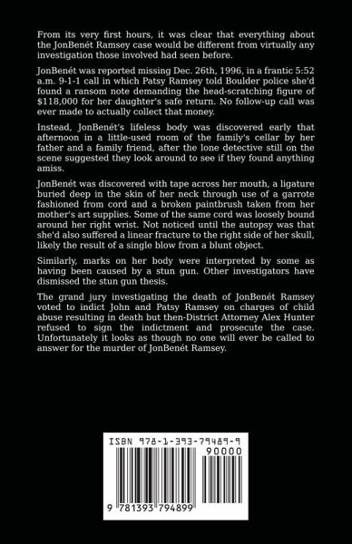 From its very first hours, it was clear that everything about the JonBenét Ramsey case would be different from virtually any investigation those involved had seen before. JonBenét was reported missing Dec. 26th, 1996, in a frantic 5:52 a.m. 9-1-1 call in which Patsy Ramsey told Boulder police she'd found a ransom note demanding the head-scratching figure of $118,000 for her daughter's safe return. No follow-up call was ever made to actually collect that money. Instead, JonBenét's lifeless body was discovered early that afternoon in a little-used room of the family's cellar by her father and a family friend, after the lone detective still on the scene suggested they look around to see if they found anything amiss. JonBenét was discovered with tape across her mouth, a ligature buried deep in the skin of her neck through use of a garrote fashioned from cord and a broken paintbrush taken from her mother's art supplies. Some of the same cord was loosely bound around her right wrist. Not noticed until the autopsy was that she'd also suffered a linear fracture to the right side of her skull, likely the result of a single blow from a blunt object. Similarly, marks on her body were interpreted by some as having been caused by a stun gun. Other investigators have dismissed the stun gun thesis. The grand jury investigating the death of JonBenét Ramsey voted to indict John and Patsy Ramsey on charges of child abuse resulting in death but then-District Attorney Alex Hunter refused to sign the indictment and prosecute the case. Unfortunately it looks as though no one will ever be called to answer for the murder of JonBenét Ramsey.