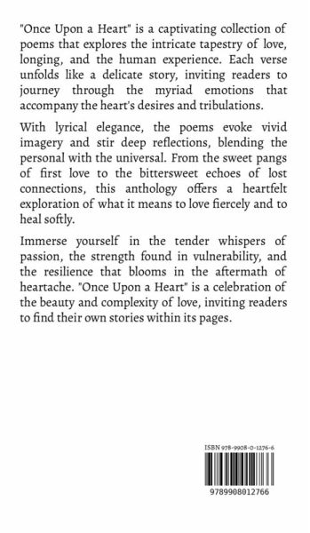 "Once Upon a Heart" is a captivating collection of poems that explores the intricate tapestry of love, longing, and the human experience. Each verse unfolds like a delicate story, inviting readers to journey through the myriad emotions that accompany the heart's desires and tribulations. With lyrical elegance, the poems evoke vivid imagery and stir deep reflections, blending the personal with the universal. From the sweet pangs of first love to the bittersweet echoes of lost connections, this anthology offers a heartfelt exploration of what it means to love fiercely and to heal softly. Immerse yourself in the tender whispers of passion, the strength found in vulnerability, and the resilience that blooms in the aftermath of heartache. "Once Upon a Heart" is a celebration of the beauty and complexity of love, inviting readers to find their own stories within its pages.