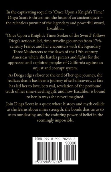 In the captivating sequel to "Once Upon a Knight's Time," Diega Scott is thrust into the heart of an ancient quest - the relentless pursuit of the legendary and powerful sword, Excalibur. "Once Upon a Knight's Time: Seeker of the Sword" follows Diega's action-filled, time-traveling journeys from 17th-century France and her encounters with the legendary Three Musketeers to the dawn of the 19th-century Americas where she battles pirates and fights for the oppressed and exploited peoples of California against an unjust and corrupt system. As Diega edges closer to the end of her epic journey, she realizes that it has been a journey of self-discovery, as fate has led her to love, betrayal, revelation of the profound truth of her time-traveling gift, and how Excalibur is bound to her in ways she never imagined. Join Diega Scott in a quest where history and myth collide as she learns about inner strength, the bonds that tie us to us to our destiny, and the enduring power of belief in the seemingly impossible.