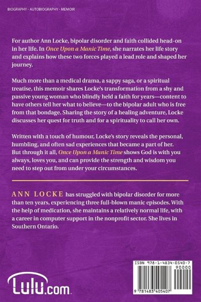 For author Ann Locke, bipolar disorder and faith collided head-on in her life. In Once Upon a Manic Time, she narrates her life story and explains how these two forces played a lead role and shaped her journey. Much more than a medical drama, a sappy saga, or a spiritual treatise, this memoir shares Locke's transformation from a shy and passive young woman who blindly held a faith for years-content to have others tell her what to believe-to the bipolar adult who is free from that bondage. Sharing the story of a healing adventure, Locke discusses her quest for truth and for a spirituality to call her own. Written with a touch of humour, Locke's story reveals the personal, humbling, and often sad experiences that became a part of her. But through it all, Once Upon a Manic Time shows God is with you always, loves you, and can provide the strength and wisdom you need to step out from under your circumstances.