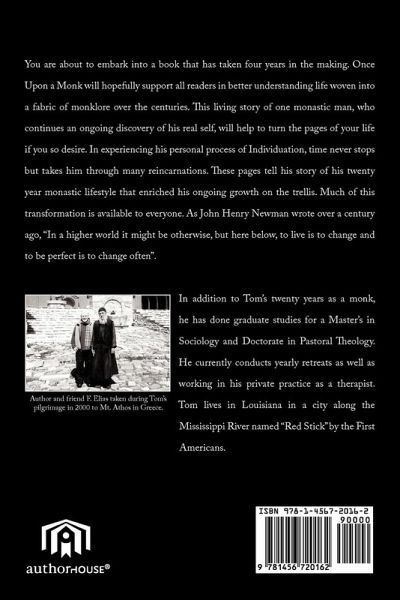 You are about to embark into a book that has taken four years in the making. Once Upon a Monk will hopefully support all readers in better understanding life woven into a fabric of monklore over the centuries. This living story of one monastic man, who continues an ongoing discovery of his real self, will help to turn the pages of your life if you so desire. In experiencing his personal process of Individuation, time never stops but takes him through many reincarnations. These pages tell his story of his twenty year monastic lifestyle that enriched his ongoing growth on the trellis. Much of this transformation is available to everyone. As John Henry Newman wrote over a century ago, "In a higher world it might be otherwise, but here below, to live is to change and to be perfect is to change often".