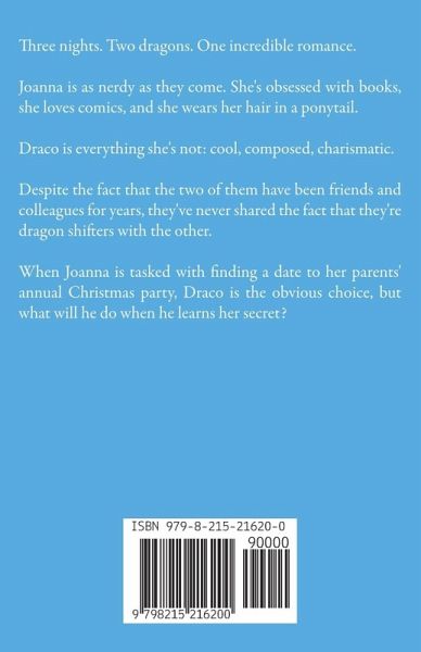 Three nights. Two dragons. One incredible romance. Joanna is as nerdy as they come. She's obsessed with books, she loves comics, and she wears her hair in a ponytail. Draco is everything she's not: cool, composed, charismatic. Despite the fact that the two of them have been friends and colleagues for years, they've never shared the fact that they're dragon shifters with the other. When Joanna is tasked with finding a date to her parents' annual Christmas party, Draco is the obvious choice, but what will he do when he learns her secret?