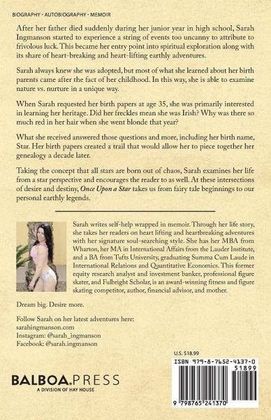 After her father died suddenly during her junior year in high school, Sarah Ingmanson started to experience a string of events too uncanny to attribute to frivolous luck. This became her entry point into spiritual exploration along with its share of heart-breaking and heart-lifting earthly adventures. Sarah always knew she was adopted, but most of what she learned about her birth parents came after the fact of her childhood. In this way, she is able to examine nature vs. nurture in a unique way. When Sarah requested her birth papers at age 35, she was primarily interested in learning her heritage. Did her freckles mean she was Irish? Why was there so much red in her hair when she went blonde that year? What she received answered those questions and more, including her birth name, Star. Her birth papers created a trail that would allow her to piece together her genealogy a decade later. Taking the concept that all stars are born out of chaos, Sarah examines her life from a star perspective and encourages the reader to as well. At these intersections of desire and destiny, Once Upon a Star takes us from fairy tale beginnings to our personal earthly legends.