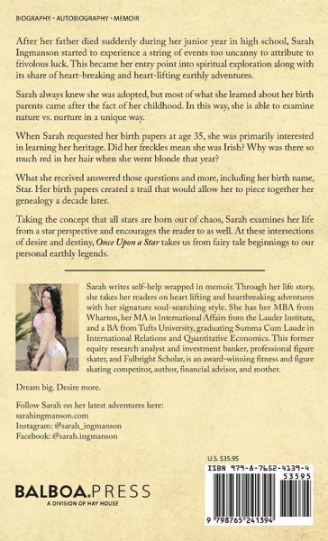 After her father died suddenly during her junior year in high school, Sarah Ingmanson started to experience a string of events too uncanny to attribute to frivolous luck. This became her entry point into spiritual exploration along with its share of heart-breaking and heart-lifting earthly adventures. Sarah always knew she was adopted, but most of what she learned about her birth parents came after the fact of her childhood. In this way, she is able to examine nature vs. nurture in a unique way. When Sarah requested her birth papers at age 35, she was primarily interested in learning her heritage. Did her freckles mean she was Irish? Why was there so much red in her hair when she went blonde that year? What she received answered those questions and more, including her birth name, Star. Her birth papers created a trail that would allow her to piece together her genealogy a decade later. Taking the concept that all stars are born out of chaos, Sarah examines her life from a star perspective and encourages the reader to as well. At these intersections of desire and destiny, Once Upon a Star takes us from fairy tale beginnings to our personal earthly legends.