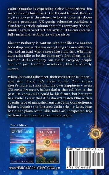 Colin O'Rourke is expanding Celtic Connections, his matchmaking business, to the UK and Ireland. However, its success is threatened before it opens its doors when a prominent UK gossip columnist publishes a slanderous article column about his company. The columnist agrees to retract her article...if he can successfully match her stubbornly-single niece. Eleanor Carberry is content with her life as a London bookshop owner. She has everything she needs-books, tea, and an aunt who is more like a mother. When her aunt asks Ellie to be the company's first client, to determine if the company can match everyday people and not just London's wealthiest, Ellie reluctantly agrees.When Colin and Ellie meet, their connection is undeniable. And though he's drawn to her, Colin knows there's more at stake than his own happiness - as an O'Rourke Protector, he has duties that call him to the past. He knows Ellie could be his future, but her aunt has made it clear that if he doesn't match Ellie with a specific type of man, she'll ensure Celtic Connections's failure. Despite the distance Colin tries to keep, Fate has other plans when Ellie takes an unexpected trip back in time...once upon a summer night.