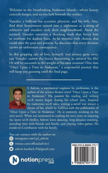 Welcome to the breathtaking Andaman Islands-where beauty conceals danger, and secrets lurk beneath the surface. Vasudev, a brilliant but eccentric physicist, and his wife, Anu, find their honeymoon turned into a nightmare as a string of robberies and murders rock their neighbourhood. Amid the turmoil, Vasudev uncovers a shocking truth that forces him to confront his darkest fears. As he wrestles with choices that could alter the past and present, he discovers that every decision carries an unforeseen consequence. In this gripping tale of love, betrayal, and science gone awry, can Vasudev outwit the forces threatening to unravel his life? Or will he succumb to the weight of his own creation? Dive into "Once Upon a Time in Andaman," a suspenseful journey that will keep you guessing until the final page.