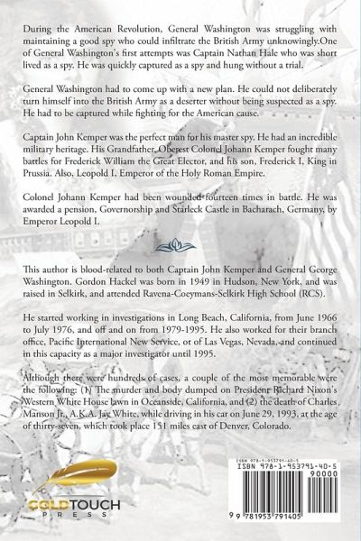 During the American Revolution, General Washington was struggling with maintaining a good spy who could infiltrate the British Army unknowingly.One of General Washington's first attempts was Captain Nathan Hale who was short lived as a spy. He was quickly captured as a spy and hung without a trial. General Washington had to come up with a new plan. He could not deliberately turn himself into the British Army as a deserter without being suspected as a spy. He had to be captured while fighting for the American cause. Captain John Kemper was the perfect man for his master spy. He had an incredible military heritage. His Grandfather, Oberest Colonel Johann Kemper fought many battles for Frederick William the Great Elector, and his son, Frederick I, King in Prussia. Also, Leopold I, Emperor of the Holy Roman Empire. Colonel Johann Kemper had been wounded fourteen times in battle. He was awarded a pension, Governorship and Starleck Castle in Bacharach, Germany, by Emperor Leopold I.