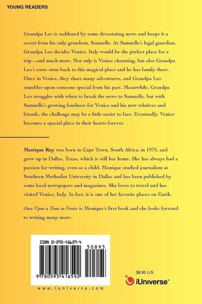Grandpa Leo is saddened by some devastating news and keeps it a secret from his only grandson, Samuelle. As Samuelle's legal guardian, Grandpa Leo decides Venice, Italy would be the perfect place for a trip-and much more. Not only is Venice charming, but also Grandpa Leo's roots stem back to this magical place and he has family there. Once in Venice, they share many adventures, and Grandpa Leo stumbles upon someone special from his past. Meanwhile, Grandpa Leo struggles with when to break the news to Samuelle, but with Samuelle's growing fondness for Venice and his new relatives and friends, the challenge may be a little easier to face. Eventually, Venice becomes a special place in their hearts forever.