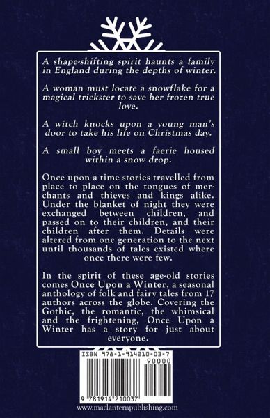 A shape-shifting spirit haunts a family in England during the depths of winter. A woman must locate a snowflake for a magical trickster to save her frozen true love. A witch knocks upon a young man's door to take his life on Christmas day. A small boy meets a faerie housed within a snow drop. Once upon a time stories travelled from place to place on the tongues of merchants and thieves and kings alike. Under the blanket of night they were exchanged between children, and passed on to their children, and their children after them. Details were altered from one generation to the next until thousands of tales existed where once there were few. In the spirit of these age-old stories comes Once Upon a Winter, a seasonal anthology of folk and fairy tales from 17 authors across the globe. It covers the Gothic, the romantic, the whimsical, the frightening and everything in-between, and features both intriguing twists on classic tales and exciting original stories. The first of four planned seasonal anthologies from Macfarlane Lantern Publishing, Once Upon a Winter is sure to have a story for just about everyone. Grab your copy in time for Christmas today! Inside this anthology: The Biting Cold by Josie Jaffrey The Match Girl by Rebecca F. Kenney Santa Claus is Coming to Town by Bharat Krishnan A Pea Ever After by Adie Hart The Snow Drop by H. L. Macfarlane Silverfoot's Edge by Ella T. Holmes The Storm Hags by Caroline Logan The Boggart of Boggart Hole Clough by Jake Curran-Pipe Around the Hawthorne Tree by Jenna Smithwick The Best Girl this Side of Winter by Laila Amado The Snow Trolls by S. Markem Lord of the Forest by Katherine Shaw Queen of the Snows by Joyce Reynolds-Ward Long Meg and the Sorcerer's Stones by M. J. Weatherall The Frost of Mercy by A. J. Van Belle Wintercast by R. A. Gerritse You Can't See Me by Kate Longstone