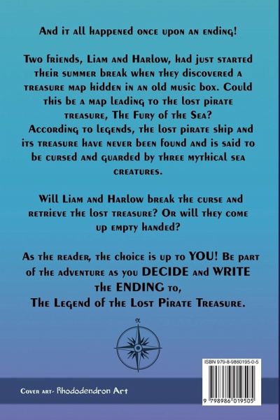 And it all happened once upon an ending! Two friends, Liam and Harlow, had just started their summer break when they discovered a treasure map hidden in an old music box. Could this be the map leading to the lost pirate treasure, The Fury of the Sea? According to legends, the lost pirate ship and its treasure have never been found and are said to be cursed and guarded by three mythical sea creatures. Will Liam and Harlow break the curse and retrieve the lost treasure? Or will they come up empty-handed?As the reader, the choice is up to YOU! Be part of the adventure as you DECIDE and WRITE the ENDING to, The Legend of the Lost Pirate Treasure.