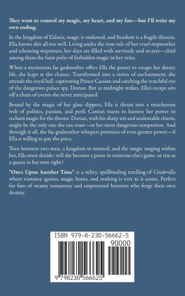 They want to control my magic, my heart, and my fate-but I'll write my own ending. In the kingdom of Eldaria, magic is outlawed, and freedom is a fragile illusion. Ella knows this all too well. Living under the iron rule of her cruel stepmother and scheming stepsisters, her days are filled with servitude and secrets-chief among them the faint pulse of forbidden magic in her veins. When a mysterious fae godmother offers Ella the power to escape her dreary life, she leaps at the chance. Transformed into a vision of enchantment, she attends the royal ball, captivating Prince Cassian and catching the watchful eye of the dangerous palace spy, Dorian. But as midnight strikes, Ella's escape sets off a chain of events she never anticipated. Bound by the magic of her glass slippers, Ella is thrust into a treacherous web of politics, passion, and peril. Cassian wants to harness her power to reclaim magic for the throne. Dorian, with his sharp wit and undeniable charm, might be the only one she can trust-or her most dangerous temptation. And through it all, the fae godmother whispers promises of even greater power-if Ella is willing to pay the price. Torn between two men, a kingdom in turmoil, and the magic surging within her, Ella must decide: will she become a pawn in someone else's game, or rise as a queen in her own right? "Once Upon Another Time" is a sultry, spellbinding retelling of Cinderella where romance ignites, magic burns, and nothing is ever as it seems. Perfect for fans of steamy romantasy and empowered heroines who forge their own destiny.