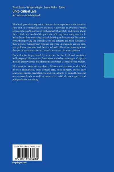 This book provides insights into the care of cancer patients in the intensive care unit in a comprehensive manner. It provides an evidence-based approach to practitioners and postgraduate students to understand about the critical care needs of the patients suffering from malignancies. It helps the readers to develop critical thinking and encourage discussion towards improving the overall care of the patients and their families as their optimal management requires expertise in oncology, critical care, and palliative medicine and there is a dearth of books explaining about the special requirements and critical care needs of cancer patients.