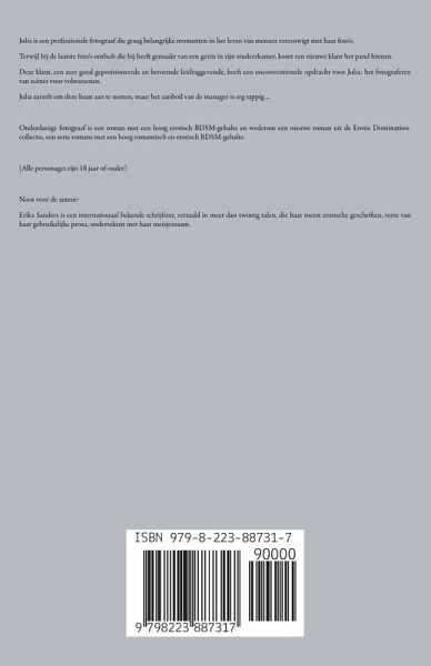 Julia is een professionele fotograaf die graag belangrijke momenten in het leven van mensen vereeuwigt met haar foto's. Terwijl hij de laatste foto's onthult die hij heeft gemaakt van een gezin in zijn studeerkamer, komt een nieuwe klant het pand binnen. Deze klant, een zeer goed gepositioneerde en beroemde leidinggevende, heeft een onconventionele opdracht voor Julia: het fotograferen van scènes voor volwassenen. Julia aarzelt om deze baan aan te nemen, maar het aanbod van de manager is erg sappig ... Onderdanige fotograaf is een roman met een hoog erotisch BDSM-gehalte en wederom een nieuwe roman uit de Erotic Domination-collectie, een serie romans met een hoog romantisch en erotisch BDSM-gehalte. (Alle personages zijn 18 jaar of ouder) Noot voor de auteur: Erika Sanders is een internationaal bekende schrijfster, vertaald in meer dan twintig talen, die haar meest erotische geschriften, verre van haar gebruikelijke proza, ondertekent met haar meisjesnaam.