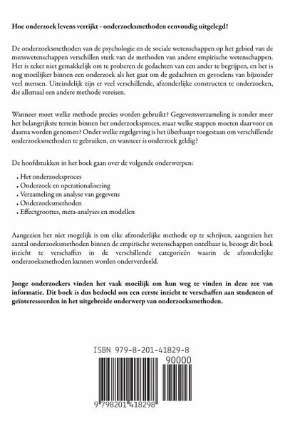 Hoe onderzoek levens verrijkt - onderzoeksmethoden eenvoudig uitgelegd! De onderzoeksmethoden van de psychologie en de sociale wetenschappen op het gebied van de menswetenschappen verschillen sterk van de methoden van andere empirische wetenschappen. Het is zeker niet gemakkelijk om te proberen de gedachten van een ander te begrijpen, en het is nog moeilijker binnen een onderzoek als het gaat om de gedachten en gevoelens van bijzonder veel mensen. Uiteindelijk zijn er veel verschillende, afzonderlijke constructen te onderzoeken, die allemaal een andere methode vereisen. Wanneer moet welke methode precies worden gebruikt? Gegevensverzameling is zonder meer het belangrijkste terrein binnen het onderzoeksproces, maar welke stappen moeten daarvoor en daarna worden genomen? Onder welke regelgeving is het überhaupt toegestaan om verschillende onderzoeksmethoden te gebruiken, en wanneer is onderzoek geldig? De hoofdstukken in het boek gaan over de volgende onderwerpen:Het onderzoeksproces Onderzoek en operationalisering Verzameling en analyse van gegevens Onderzoeksmethoden Effectgroottes, meta-analyses en modellen Aangezien het niet mogelijk is om elke afzonderlijke methode op te schrijven, aangezien het aantal onderzoeksmethoden binnen de empirische wetenschappen ontelbaar is, beoogt dit boek inzicht te verschaffen in de verschillende categorieën waarin de afzonderlijke onderzoeksmethoden kunnen worden onderverdeeld. Jonge onderzoekers vinden het vaak moeilijk om hun weg te vinden in deze zee van informatie. Dit boek is dus bedoeld om een eerste inzicht te verschaffen aan studenten of geïnteresseerden in het uitgebreide onderwerp van onderzoeksmethoden.