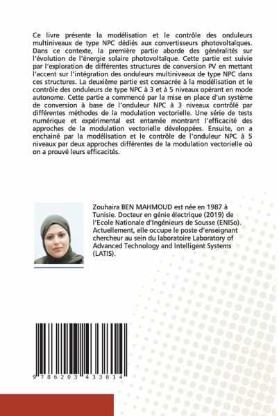Ce livre présente la modélisation et le contrôle des onduleurs multiniveaux de type NPC dédiés aux convertisseurs photovoltaïques. Dans ce contexte, la première partie aborde des généralités sur l'évolution de l'énergie solaire photovoltaïque. Cette partie est suivie par l'exploration de différentes structures de conversion PV en mettant l'accent sur l'intégration des onduleurs multiniveaux de type NPC dans ces structures. La deuxième partie est consacrée à la modélisation et le contrôle des onduleurs de type NPC à 3 et à 5 niveaux opérant en mode autonome. Cette partie a commencé par la mise en place d'un système de conversion à base de l'onduleur NPC à 3 niveaux contrôlé par différentes méthodes de la modulation vectorielle. Une série de tests numérique et expérimental est entamée montrant l'efficacité des approches de la modulation vectorielle développées. Ensuite, on a enchainé par la modélisation et le contrôle de l'onduleur NPC à 5 niveaux par deux approches différentes de la modulation vectorielle où on a prouvé leurs efficacités.