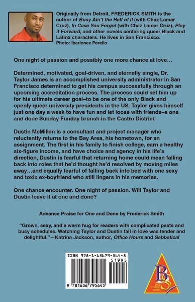 One night of passion and possibly one more chance at love... Determined, motivated, goal-driven, and eternally single, Dr. Taylor James is an accomplished university administrator in San Francisco determined to get his campus successfully through an upcoming accreditation process. The process could set him up for his ultimate career goal-to be one of the only Black and openly queer university presidents in the US. Taylor gives himself just one day a week to have fun and let loose with friends-a one and done Sunday Funday brunch in the Castro District. Dustin McMillan is a consultant and project manager who reluctantly returns to the Bay Area, his hometown, for an assignment. The first in his family to finish college, earn a healthy six-figure income, and have choice and agency in his life's direction, Dustin is fearful that returning home could mean falling back into roles that he'd thought he'd resolved by moving miles away...and equally fearful of falling back into bed with one sexy and toxic ex-boyfriend who still lingers in his memories. One chance encounter. One night of passion. Will Taylor and Dustin leave it at one and done?
