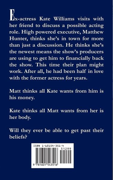 Ex-actress Kate Williams visits with her friend to discuss a possible acting role. High powered executive, Matthew Hunter, thinks she's in town for more than just a discussion. He thinks she's the newest means the show's producers are using to get him to financially back the show. This time their plan might work. After all, he had been half in love with the former actress for years. Matt thinks all Kate wants from him is his money. Kate thinks all Matt wants from her is her body. Will they ever be able to get past their beliefs?