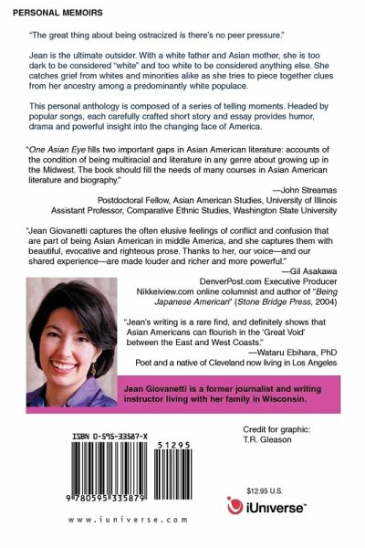 "The great thing about being ostracized is there's no peer pressure." Jean is the ultimate outsider. With a white father and Asian mother, she is too dark to be considered "white" and too white to be considered anything else. She catches grief from whites and minorities alike as she tries to piece together clues from her ancestry among a predominantly white populace. This personal anthology is composed of a series of telling moments. Headed by popular songs, each carefully crafted short story and essay provides humor, drama and powerful insight into the changing face of America. "One Asian Eye fills two important gaps in Asian American literature: accounts of the condition of being multiracial and literature in any genre about growing up in the Midwest. The book should fill the needs of many courses in Asian American literature and biography." --John Streamas Postdoctoral Fellow, Asian American Studies, University of Illinois Assistant Professor, Comparative Ethnic Studies, Washington State University "Jean Giovanetti captures the often elusive feelings of conflict and confusion that are part of being Asian American in middle America, and she captures them with beautiful, evocative and righteous prose. Thanks to her, our voice--and our shared experience--are made louder and richer and more powerful." --Gil Asakawa DenverPost.com Executive Producer Nikkeiview.com online columnist and author of Being Japanese American (Stone Bridge Press, 2004) "Jean's writing is a rare find, and definitely shows that Asian Americans can flourish in the 'Great Void' between the East and West Coasts." --Wataru Ebihara, PhD Poet and a native of Cleveland now living in Los Angeles