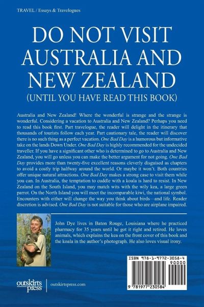 Australia and New Zealand! Where the wonderful is strange and the strange is wonderful. Considering a vacation to Australia and New Zealand? Perhaps you need to read this book first. Part travelogue, the reader will delight in the itinerary that thousands of tourists follow each year. Part cautionary tale, the reader will discover there is no such thing as a perfect vacation. One Bad Day is a humorous but informative take on the lands Down Under. One Bad Day is highly recommended for the undecided traveller. If you have a significant other who is determined to go to Australia and New Zealand, you will go unless you can make the better argument for not going. One Bad Day provides more than twenty-five excellent reasons to avoid a costly trip halfway around the world. Or maybe it won’t. Both countries offer unique attractions. One Bad Day makes a strong case to visit them while you can. In Australia, the temptation to cuddle with a koala is hard to resist. In New Zealand, you may encounter the kea, a large green parrot, on the South Island and the incomparable kiwi, the national symbol, on the North Island. Encounters with either will change the way you think about birds—and life. Reader discretion is advised. One Bad Day is not suitable for those who are airplane impaired.
