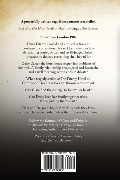 One Beat of a Heart, is all it takes to change a life forever. London 1902 When tragedy strikes at The Fitzroy Hotel on King Edward V!!'s Coronation Day, lives are thrown into turmoil. As the drama unfolds, stretching out like ripples in a pond, no one escapes the consequences. Clara's recently impoverished family hope a suitable marriage for her will restore their finances, but her refusal to conform and reckless behaviour have devastating consequences. Will an ill-judged liaison destroy everything she's longed for?Daisy Carter, the hotel housekeeper, has problems of her own. A family relationship brings grief and heartache and a well meaning action ends in disaster. A life-changing moment, a heartbreaking choice. Can Clara follow her heart to find the happiness she craves? Can Daisy keep her family together when fate is pulling them apart? Can they rely on each other when their futures depend on it? Follow the fortunes of Clara and Daisy's in the first of The Fitzroy Hotel Stories from the bestselling author of The Hope Series. Perfect for fans of Downton Abbey and Upstairs Downstairs.
