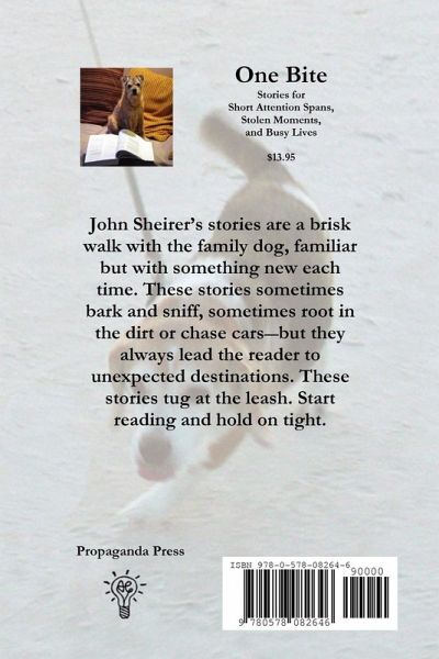One Bite: Stories for Short Attention Spans, Stolen Moments, and Busy Lives -- John Sheirer's short stories chronicle moments that seem ordinary. A middle-aged man sends his first text message. A simple knee surgery goes in an unexpected direction. An innocently friendly wave invites ridicule. The neighbors' dogs won't stop barking. But, in the hands of a master storyteller such as John Sheirer, these moments become far from ordinary. Sheirer's stories range from "hint" fiction of a few sentences, to "flash" fiction of one to four pages, to a few traditional-length stories. Most of the stories have won awards or been published in print and online literary journals. They are often humorous and occasionally poignant, always showing the trademark wit and wisdom that has made Sheirer's well-received memoirs so popular. Each story from this award-winning writing teacher provides surprise, delight, and an odd take on the world that only sharply written fiction can provide.