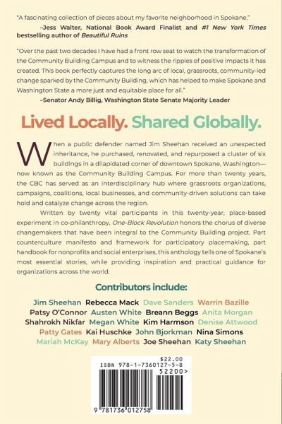 "When a public defender named Jim Sheehan received an unexpected inheritance, he decided to put his money to work for people and the planet. He purchased and renovated a cluster of six buildings in a dilapidated corner of downtown Spokane, Washington and repurposed them for the collective good. For more than twenty years these buildings, now known as the Community Building Campus, have served as an interdisciplinary hub where grassroots leaders run campaigns, build coalitions, host meetings, train activists, and transform their city. One-Block Revolution honors the chorus of diverse changemakers who show up every day to build their community. Part counterculture manifesto and framework for participatory placemaking, part handbook for nonprofits and social enterprises, this anthology tells one of Spokane's most essential stories, while providing inspiration and practical guidance for organizations across the world."--Amazon
