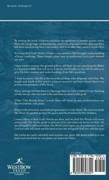 By writing this book, I hope to minimize the questions in people's minds; where there are, misgivings, interpretations, traditions, rites and rituals; that may have left them questioning their relationship with God; after they came to know Him. As I searched God's Word, I found many answers that brought understanding of Jesus' teachings. These simple, plain, easy to understand principals opened my eyes. I have tried to portray the greatest gift we will find: (in our searching the Bible) is a heavenly Father that will never leave us, nor forsake us, but will be with us to give His love, wisdom and understanding of our life's questions. I hope to convey that He is the rewarder of those who diligently seek Him. The height and depth of His word is without measure; and have found there is no private interpretation of His Word. These writings tell that there is a blessing when we have it settled in our thinking of who we are, who we want to be, and how to achieve that goal? When "One Breath Away," is read, there will never be any condemnation nor discrimination; only peace. Every truth presented, is rooted and grounded in God's Word. The more we study His Word the greater we find His grace and His freedom for His children. I want others to find God's Words are alive, and we find His Words will never return void. His Words speak to each one of us, just where we are in our faith. We are all reared in different beliefs. His Word covers each one of us wherever we are. God not only will reach out His hand to you; but will gently lead you with His love. His truths are easily entreated and enriches our spirit. His word settles it in our heart and mind that we can please our heavenly Father.