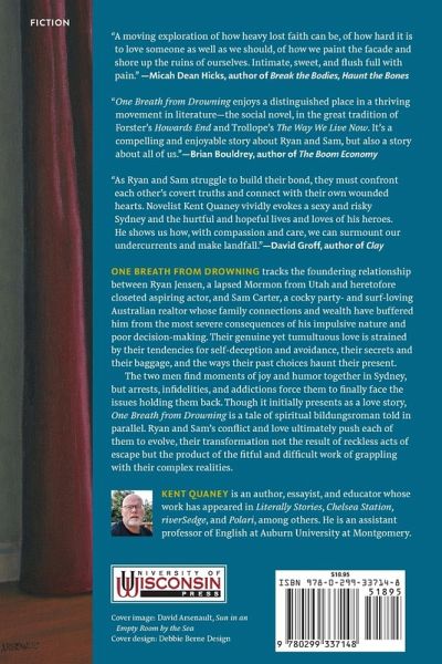 One Breath from Drowning tracks the foundering relationship between Ryan Jensen, a lapsed Mormon from Utah and heretofore closeted aspiring actor, and Sam Carter, a cocky party- and surf-loving Australian realtor whose family connections and wealth have buffered him from the most severe consequences of his impulsive nature and poor decision-making. Their genuine yet tumultuous love is strained by their tendencies for self-deception and avoidance, their secrets and their baggage, and the ways their past choices haunt their present. The two men find moments of joy and humor together in Sydney, but arrests, infidelities, and addictions force them to finally face the issues holding them back. Though it initially presents as a love story, One Breath from Drowning is a tale of spiritual bildungsroman told in parallel. Ryan and Sam's conflict and love ultimately push each of them to evolve, their transformation not the result of reckless acts of escape but the product of the fitful and difficult work of grappling with their complex realities.